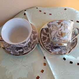 Elegante coppia tazze con piattini in porcellana d'epoca finemente decorate ad Hong Kong marchiate sotto, con fine decoro colore argento su fondo candido, misure tazza h. cm.7 e diametro cm.9, piatto diametro 14,perfette,veno a 20 euro.