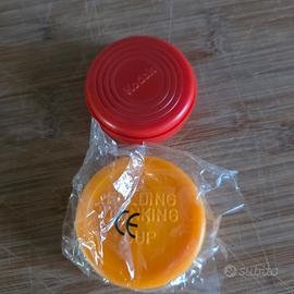 Coppia tazze vintage pieghevoli in plastica rossa e gialla, marchio "Kodak". Le tazze sono composte da sezioni che si impilano una sull'altra per renderle compatte. La parte superiore, che funge da coperchio quando la tazza è chiusa, reca la scritta "FOLDING DRINKING CUP".
