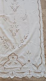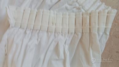 coppia di tendoni bianche, ricco di ricamo ad intaglio ,lavorate sotto in maniera pregiata, sopra sono arricciate compresa di fascietta per ganci in ottimo stato di alta qualità le misure sono altezza tende 270 cm ,larghezza sotto 190 cm ,larghezza sopra 100 cm