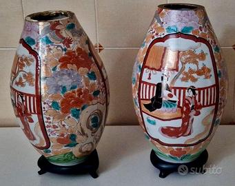 Coppia di Vasi originali dipinti a mano Cinesi. Splenditi e molto ben conservati: ideali come base per tavolo o vasi per piante secche floreali da arredo. Disegnate a mano scene in costume e colori floreali. Pezzi unici da estimatore e per creare un'arredo in casa unico da far ammirare. Il tutto corredato da x2 basi in legno mogano per sostenere ed evidenziare l'importanza dei pezzi: