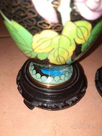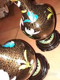 Vendo coppia di vasi cloisonné originali, in metallo smaltato con raffinata decorazione floreale orientale e completi di basi in legno nero lavorato.