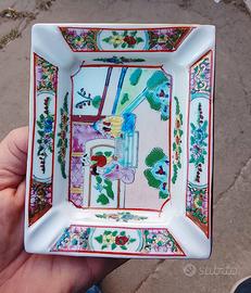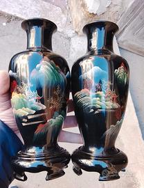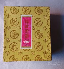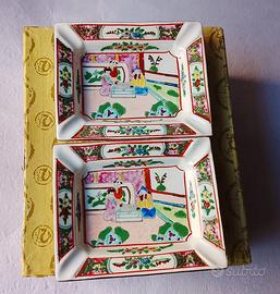 In vendita, un affascinante set coordinato di oggettistica orientale vintage, perfetto per collezionisti o per un tocco di eleganza chinoiserie nell'arredamento. Il lotto comprende: 1. Coppia di Vasi in Lacca Fujian (Made in China, anni '70/'80) Rara coppia di vasi realizzati con la celebre tecnica bodiless lacquer (lacca senza corpo), famosi per la loro incredibile leggerezza e brillantezza. Finitura: Lacca nera lucida con una splendida pittura a mano di paesaggi tradizionali: montagne, pagode rosse, foreste di bambù e pini Forma: Silhouette ottagonale elegante e dinamica. Condizioni: Perfette, New Old Stock (Fondo di magazzino), mai esposti. Inclusi i basamenti integrati in lacca e la loro scatola originale con etichetta. 2. Due Posaceneri in Ceramica Cantonese con Decorazioni a Rilievo Coppia di posaceneri quadrati in ceramica cinese, riccamente decorati a mano con scene di vita di corte. Dettagli artistici: La decorazione centrale presenta personaggi in costumi tradizionali circondati da un paesaggio dettagliato. I bordi sono arricchiti da motivi floreali e simbolici (pipistrelli, fenici) realizzati a rilievo, che conferiscono profondità e un'esperienza tattile unica Finitura: Bordatura a rilievo in rosso opaco che definisce lo stile cantonese classico. Condizioni: Eccellenti, senza sbeccature o difetti, conservati con cura.