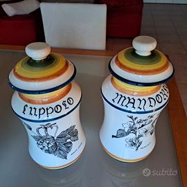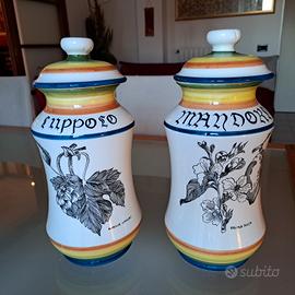 Vendo coppia di vasi in ceramica smaltata decorati a mano, ricevuti come regalo di nozze e mai utilizzati, in condizioni perfette. I vasi presentano uno stile classico con decorazioni botaniche e scritte in stile antico: uno con motivo di luppolo uno con motivo floreale (mandorlo) Dimensioni: Altezza: 33 cm Circonferenza nel punto più largo: 46 cm