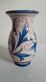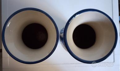 Antica coppia di vasi in maiolica crackle italiani di lavorazione artigianale, lavorati e dipinti a mano. I contorni neri di ciascun fiore blu sono incisi nella creta. Vendibili anche separatamente tuttavia essendo solo uno firmato in caso di vendita separata quello con la firma avrà un prezzo di €35 quello senza firma €30. Entrambi sono in perfette condizioni senza scheggiature. Quello firmato è mezzo centimetro più alto (25,5 cm) rispetto all'altro ed ha un peso leggermente inferiore (1,12 kg) rispetto all'altro che pesa 1,17 kg. In caso di vendita separata anche le spese di spedizione saranno ridotte rispetto a quelle indicate nell'annuncio.