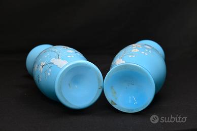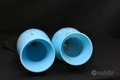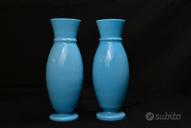 Incantevole coppia di vasi gemelli in vetro opalino azzurro, un pezzo da collezione dal grande impatto decorativo.