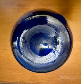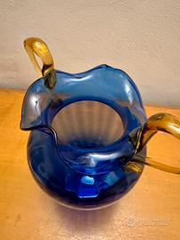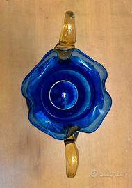 Elegante coppia di vasi in retro soffiato, attribuibili a produzione di Murano, anni 70. Realizzati in vetro blu cobalto con caratteristiche anse applicate color ambra, lavorate a caldo. Il bordo ondulato e le leggere irregolarità testimoniano la lavorazione artigianale. Oggetti decorativi di grande effetto, ideali per arredamento vintage o moderno. Dimensioni: Altezza: 25 cm. Diametro 18 cm. Spedizione accurata.