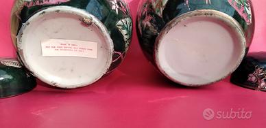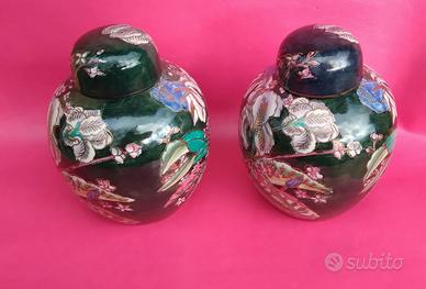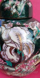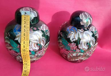 Vasi artigianali cinesi vintage in porcellana policroma, potiche o ginger jar, decorato con intricati motivi floreali dai colori vivaci su sfondo