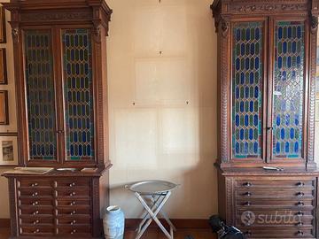 coppia vetrine in legno e cristalli colorati con cassetti e sportellini