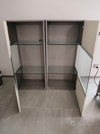 Vetrine moderne con mensole in vetro e sistema apertura push. Cassone colore rovere grigio e anta colore panna. Misura L120xH128xP42 Completo di spinotti e staffe per il montaggio Prezzo trattabile Non spedisco