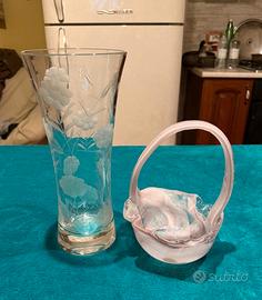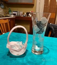 Vaso vintage in vetro trasparente con decorazione floreale più cesto in vetro cristallo entrambi nuovissimi