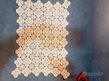 Elegante copritavola realizzato interamente all'uncinetto, rettangolare o di un runner da tavola all'uncinetto (crochet), caratterizzato da un motivo a pizzo delicato composto da quadrati modulari di colore ecrù. Il lavoro è realizzato a mano all'uncinetto, utilizzando una tecnica che ricorda il punto filet, alternando spazi pieni e vuoti per creare il disegno. Il motivo include elementi floreali stilizzati all'interno di ogni quadrato.Le misure sono in foto tempo realizzazione Circa 10gg prezzo simbolico 🤴ne ho diverse misure e tipologie guarda le mie pagine - Chiedi info - ne ho di diverso colore disegno misura e tipologia di lavorazione (antichi artigiani)