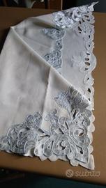 Copri tavolo o tavolino misura cn 84 bianco con applicazioni in celeste, volendo si può arricchire con ricami , tessuto adatto a punto croce
