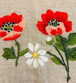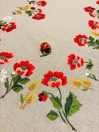 Copri tavolo arredo vintage, fine anno ‘80 , in morbido e resistente tessuto di misto lino e poliestere a fondo ecru’.