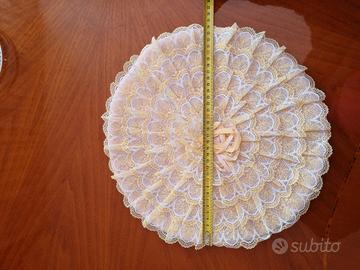 Copri borsa acqua calda. Rotonda. Tessuto trapuntato con motivo floreale in tulle. Rosa e gialla. Vintage. Design elegante. Diametro cm 34. Ottime condizioni.
