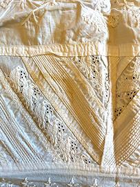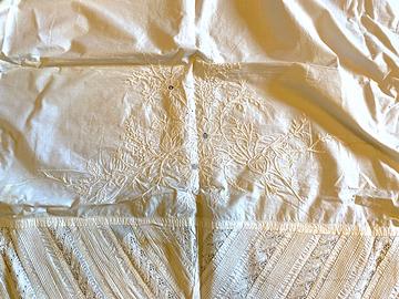 Cornice esterna di pizzo ricamato con motivo ripetuto di uccellini, ampia cornice interna alternata a sbalzi plissettati e ricami con motivo di uccellini. Tutto fatto a mano, in perfetto stato di conservazione, senza strappi o danneggiamenti di nessun tipo. Solo una leggera macchia del tempo come da dettaglio. Materiale: cotone finissimo. Dimensioni: 113 cm x 91 cm.
