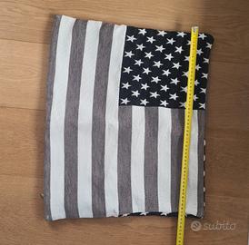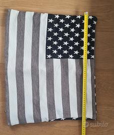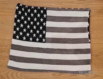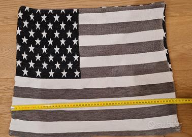 Vendo un elegante copricuscino in maglia con motivo a righe e stelle, ispirato alla bandiera americana. I colori predominanti sono il grigio e il bianco, con una parte superiore nera decorata da stelle bianche. Realizzato con materiali di alta qualità, è perfetto per aggiungere un tocco patriottico e di design alla tua casa.