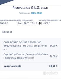 Vendo copridivano genius a tre posti + 4 copri cuscini Pari al nuovo, solamente un angelo del copri cuscino è leggermente rovinato ma è presente uno in più ancora nella confezione