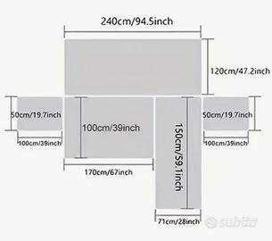 Dimensioni: 2,40 x 2,70 metri, recersibile quindi adatto per divani grandi con penisola a DX o SX o angolari.