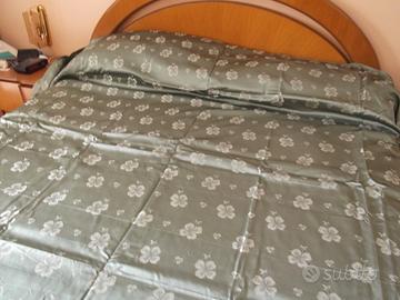 2 copriletti matrimoniali in raso damascato: 1 verde salvia con frange su 3 lati, cm. 260x223 + frange; 1 beige cm. 250x220. Nuovi con scatola, € 30 l'uno.