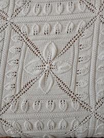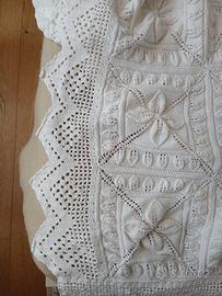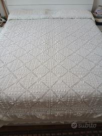 Copriletto matrimoniale realizzato a uncinetto, mai usato, semplicemente lavato e sistemato sul letto per scattare queste fotografie. In cotone 100%, color panna. Trama floreale. Bordo rifinito con trama triangolare. Larghezza 200 cm, lunghezza 240 cm. Realizzato a mano