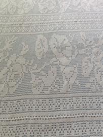 Copriletto in cotone bianco Freccia fatto all uncinetto senza macchie o difetti. Perfettamente conservato e molto bello. motivo floreale. Pizzi laterali e in fondo alla pediera. Spacchi laterali per migliore sistemazione anche per letti in ottone. Misura 3 metri larghezza per 2,50 di lunghezza.