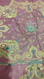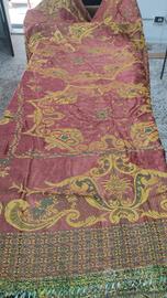 COPRILETTO DAMASCATO MATRIMONIALE, COLORE BORDEAUX-GIALLO ORO, CON FRANGIA Copriletto Damascato matrimoniale, di colore bordeaux e giallo oro, con frangia, anni cinquanta/sessanta. Dimensioni centimetri 220 * 220, oltre cingoli. Usato pochissimo e in Ottime condizioni.