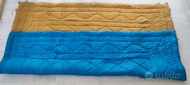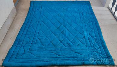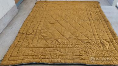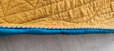 Coperta trapuntata a rombi e motivi ondulati sul bordo. Dimensioni: 175 cm x 145 cm circa. Ha una consistenza piuttosto pesante, infatti pesa circa due kg ed è imbottita. Bicolore double-face: da un lato blu e dall'altro lato color senape. Alcuni segni del tempo visibili. Da lavare e rinfrescare. #trapunta #coperta #trapuntato #copriletto