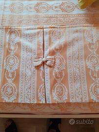Copriletto matrimoniale con decori colore giallo-oro. Ottima qualità e rifiniture. In omaggio, mantovana per tende. Il tutto è come nuovo. La foto del copriletto è stata fatta sul rovescio del tessuto, il lato principale risulta uguale al tessuto della mantovana.