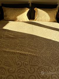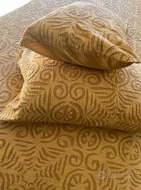 Copriletto etnico in cotone 100% di provenienza indiana originale. Colore giallo con disegni etnici. Con supplemento di 8 euro disponibili anche due copricuscini
