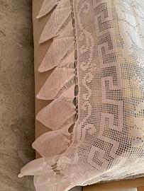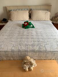 Copriletto fatto a mano a punto filet ,in puro cotone con balza importante sui tre lati ,con immagini angeliche ripetitive