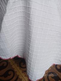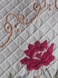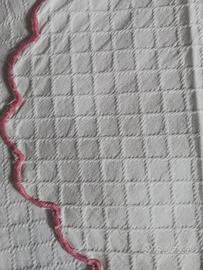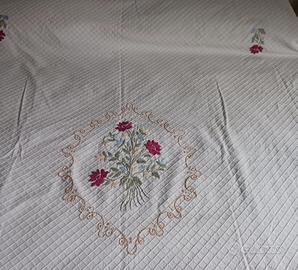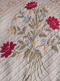 copriletto con ricamo centrale fatto a mano e quattro rose ricamate sui lati smerlato , in piquet a forma di rombi ,cotone robusto. misure 230 altezza. 260 larghezza