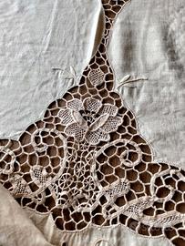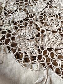 grande pregio, realizzato in lino naturale chiaro con ampio inserto centrale in pizzo interamente lavorato a mano.