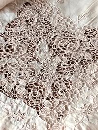 La lavorazione è estremamente ricca e complessa: motivi floreali continui, rete fitta e regolare, rilievi ben definiti e grande armonia del disegno, tipici dei corredi nuziali tradizionali di alta qualità.