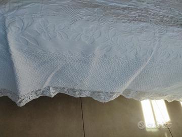 Tessuto artigianale sardo, piquet spesso di colore bianco, disegni in rilievo e pizzo realizzato ad uncinetto,sia nella parte bassa che nella parte alta,come nuovo, presenta tre macchie gialle del baule che vanno via al lavaggio.Dimensione larghezza 212 cm, lunghezza 253 cm, pizzo basso 10 cm,pizzo alto 21 cm.