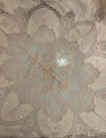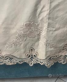 Pregiato copriletto in lino e pizzo cantu’, ricami fatti a mano sofisticati, raffinati trafori e dettagli molto particolari e di alta qualita’, misure “ 275x250”, mai usato, adatto anche come regalo