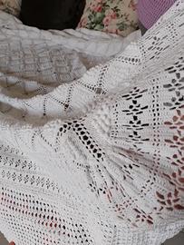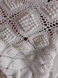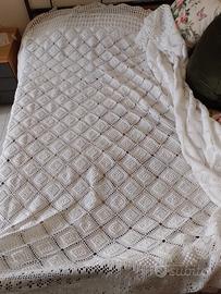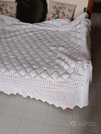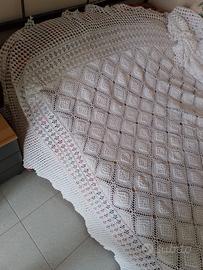 Copriletto matrimoniale all'Uncinetto lavorato a mano. Di colore bianco, privo di imperfezioni, misure all'incirca 2,43 x 2,40.