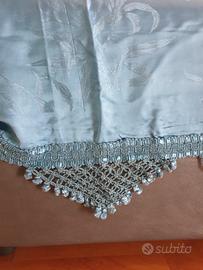 Il tessuto è liscio e leggermente lucido, dall’aspetto raffinato, mentre il bordo è arricchito da una passamaneria ricamata lavorata, con frange e nodini decorativi che danno carattere al letto (ben visibili in foto).