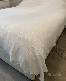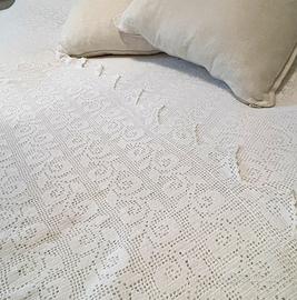 Copriletto matrimoniale in stile vintage, realizzato interamente a mano e ad uncinetto; le mani delle nonne intrise di arte, passione, valori e tempo. La coperta ha circa 30 anni di vita ad oggi ed è stata lavorata e portata a termine in circa un anno di tempo. Tenuta in buone condizioni, mai usata (si intravede appena una piccola macchia di ingiallimento dovuta al tempo, ma di sicura, semplice rimozione con il lavaggio). Misura quadrata circa 280cmx280cm. Prezzo trattabile