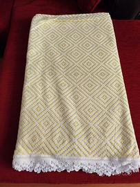 Copriletto matrimoniale anni ’70/’80 in ottime condizioni, realizzato a telaio con motivo geometrico a rombi nei toni del giallo e bianco. Materiale: cotone pesante. Non ci sono etichette visto che è un prodotto artigianale Dimensioni: circa 270 x 260 cm + frange decorative in pizzo di circa 4 cm lungo il bordo Lavorazione artigianale