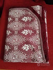 Copriletto matrimoniale realizzato a telaio alla fine degli anni ’70, mai usato e in ottime condizioni. Lavorazione jacquard, non ci sono etichette sulla coperta perchè è stato fatto a mano. Motivo a rombi con fiori stilizzati. Colore bordeaux e bianco. Materiale: Cotone pesante Dimensioni: circa 240 × 255 cm escluse le frange di circa 4 cm Prodotto artigianale, lavorato a telaio Disponibile per ulteriori foto o informazioni