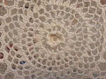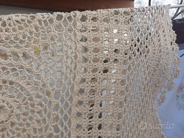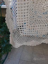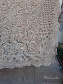 copriletto matrimoniale realizzato interamente a mano all'uncinetto in cotone di colore ecru.220x240 vintage Motivi Centrali: Ogni piastrella presenta un centro in rilievo) circondato da giri di maglie alte e archetti di catenelle che creano un effetto a raggiera. Bordo: Il perimetro è rifinito con un'ampia fascia a rete , seguita da un elaborato bordo smerlato a ventaglietti, tipico dei lavori vintage fatti a mano Tecnica: Si tratta di una lavorazione complessa che richiede pazienza e precisione nel contare le maglie per mantenere la planarità del pezzo