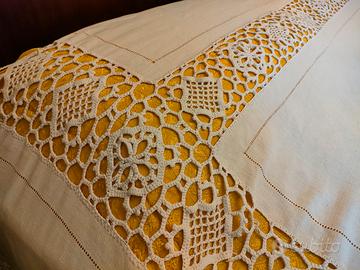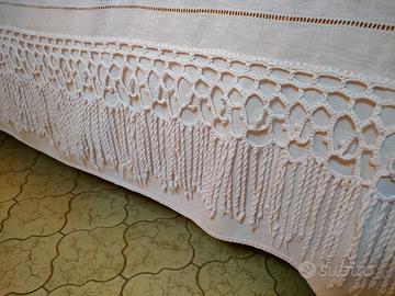 Copriletto matrimoniale d'epoca in cotone ricamato con inserto di pizzo ad uncinetto MISURE guardando l'immagine la specchiatura in tessuto ha una lunghezza di 165 cm , alla quale va aggiunto 16 cm di pizzo e altri 30 cm di tessuto dove ci sono i cuscini , per un TOTALE DI 211 CM DI LUNGHEZZA sempre guardando la specchiatura la larghezza è di 133 cm alla quale si aggiungono 18 cm di pizzo da ambo le parti e 65 cm di balza per un TOTALE DI LARGHEZZA DI 295 CM La balza di pizzo con le frange applicata alla balza laterale è alta 23 cm Il tessuto in cotone fatto a telaio è a sua volta ricamato a orlogiorno