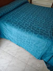 copriletto matrimoniale di alto artigianato italiano, realizzato a mano all'uncinetto (con petali in rilievo), in cotone sottile bianco, completo di copriletto in raso di cotone bluette con motivi jacquard, da utilizzare x dare risalto alla lavorazione all'uncinetto.