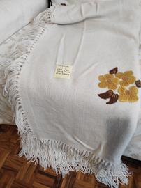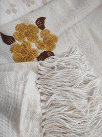 Colore beige con fiori ricamati giallo marrone. Già lavato in lavatrice.