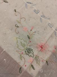 Delicati ricami floreali nei toni pastello e bordo smerlato elegante, lavorazione fine e raffinata.