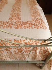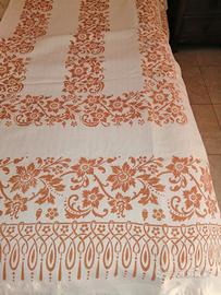 Il copriletto è di un tessuto di cotone pesante stampato a mano secondo un tecnica antica della tradizione romagnola. La stampa a ruggine è una tecnica che risale al 17esimo secolo, salvaguardata da una decina di artigiani nelle loro stamperie sparse tra Forlì-Cesena, Ravenna e Rimini. Le matrici di legno, impregnate di colore, vengono poggiate sulla stoffa e colpite con un mazzuolo, il tessuto viene così impresso con motivi ornamentali e floreali del ricco patrimonio della tradizione romagnola. Il valore attuale di un copriletto stampato a mano si aggira intorno ai 400,00 euro
