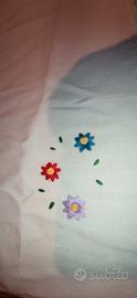 Copriletto matrimoniale realizzato a mano all'uncinetto con filo di scozia freccia bianco, ricamato a mano con motivi floreali su stoffa antica. Nuovo. Tratt.