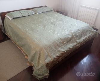 Copriletto matrimoniale vintage, verde e bianco. Con decorazioni geometriche. Tre lati con frange. Con copricuscini abbinati. Misure 220 x 230 cm. Possibilità di spedizione o di consegna a Gaggiano e limitrofi. Il ricavato verrà devoluto a scopo benefico.