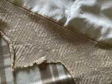 Copriletto matrimoniale vintage fatto a mano, colore écru, realizzato con strisce di tela tessuta a mano negli anni 30 del Novecento dalla mia bisnonna e strisce e