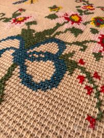 • Ricamo: Su questa base, è stato applicato un ricco e colorato ricamo a Punto Croce (o Cross-stitch). I motivi includono grandi rose, fiori stilizzati, nastri, farfalle e, in particolare, un affascinante motivo con rondini/uccelli, donando un carattere romantico e tradizionale.
